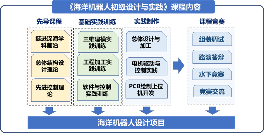 本课程分为先导课程、基础实践训练、实践制作以及课程竞赛四个部分,主要针对船舶与海洋工程专业相关领域,以海洋机器人设计为导向,重构传统理论课程知识体系。学生在老师的带领下从基础实践训练过渡到团队实践任务,开展引导式创新实践,将设计目标拆解为六个板块,通过小组合作形式完成机器人设计制作。运用趣味评价机制助推创新实践发展,全面评估学生的表达能力、创新能力、作品的可行性与实用性,形成以老师指导,研究生参与,本科生参加的形式,打通知识壁垒,增进知识层级的交流与合作。采用以赛代考的考核机制,通过路演答辩、平时成绩、水下竞赛三部分进行最终评价。通过创新实验室沉浸师生互动式的海洋机器人研发训练,培养了学生应用海洋工程、机械、电子控制、材料等知识解决海洋智能工程问题的综合实践和创新能力。